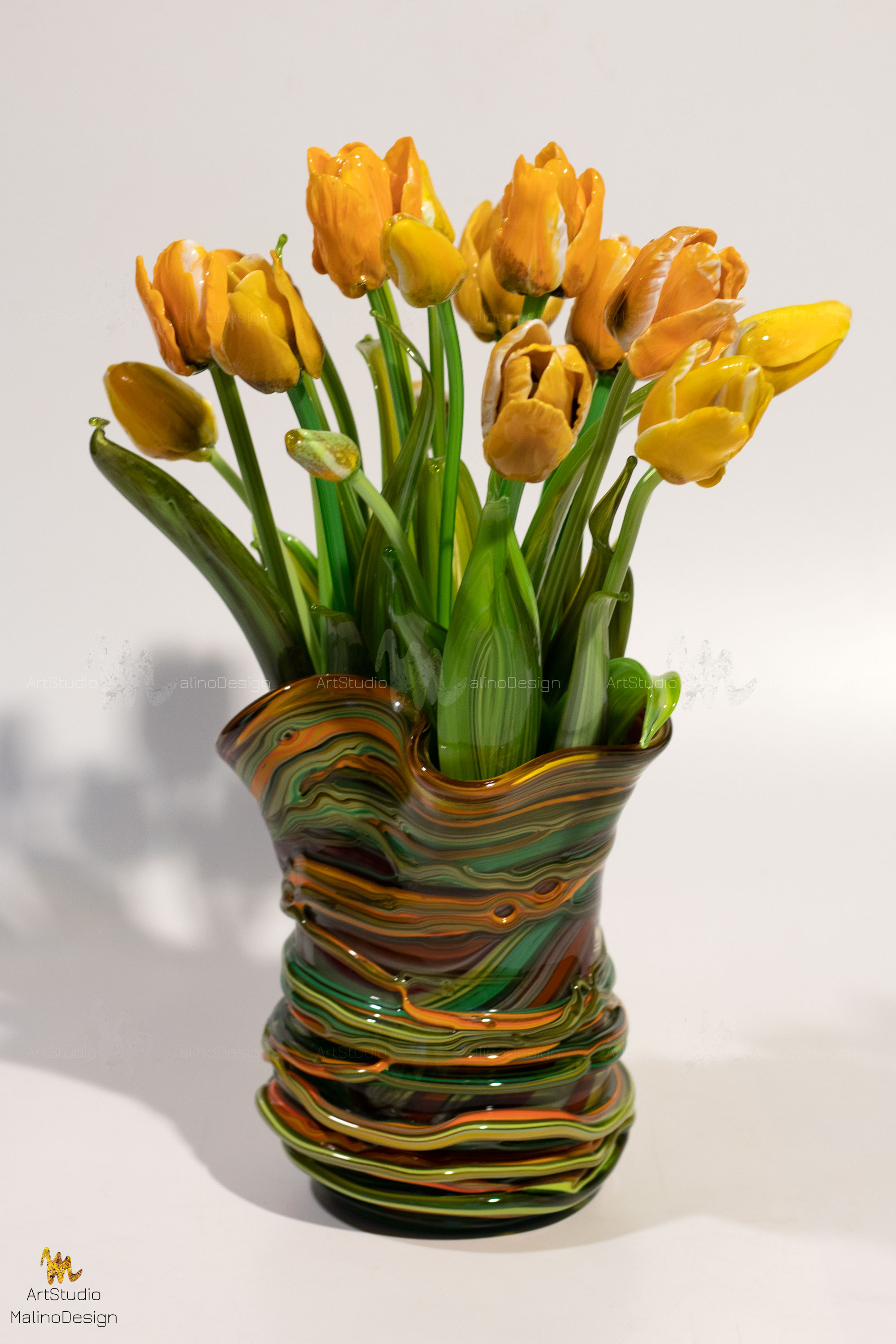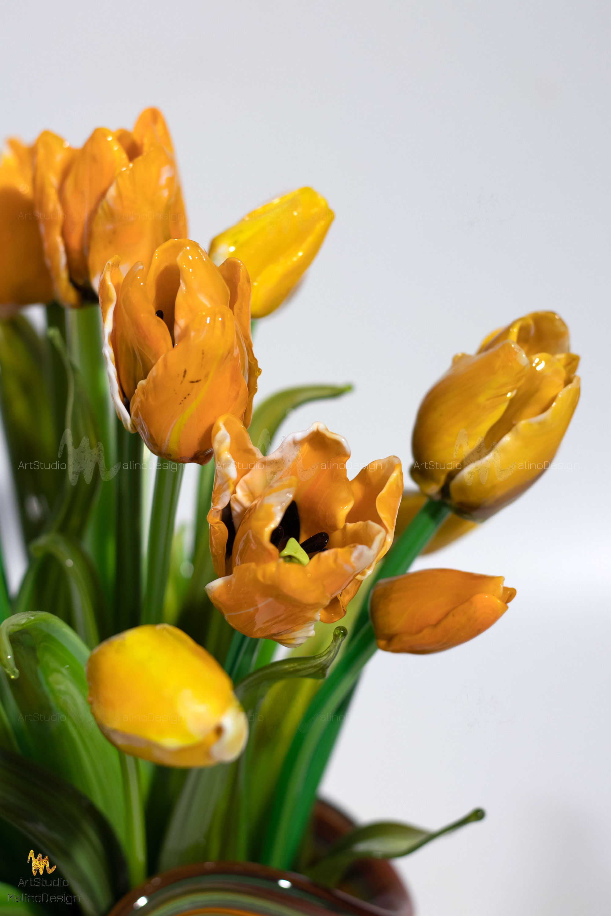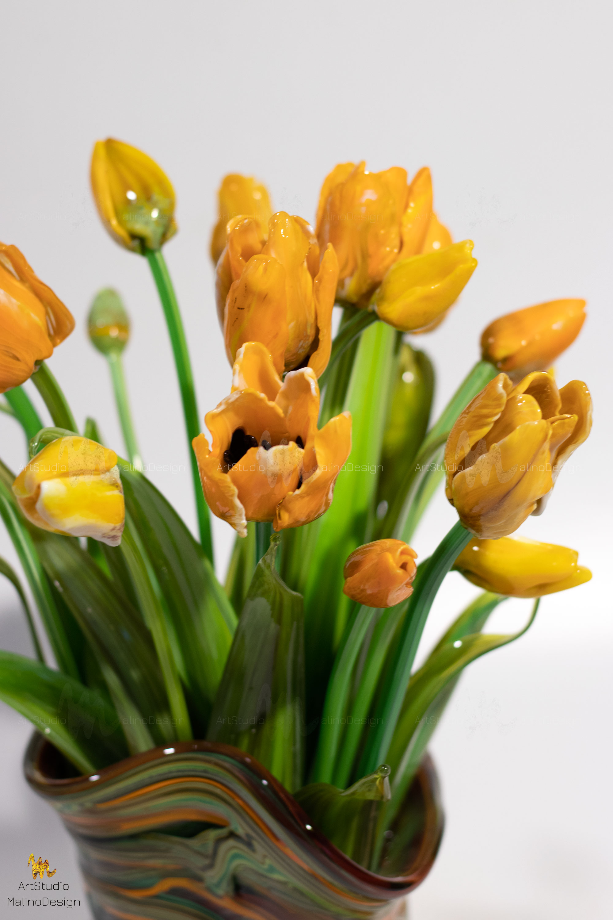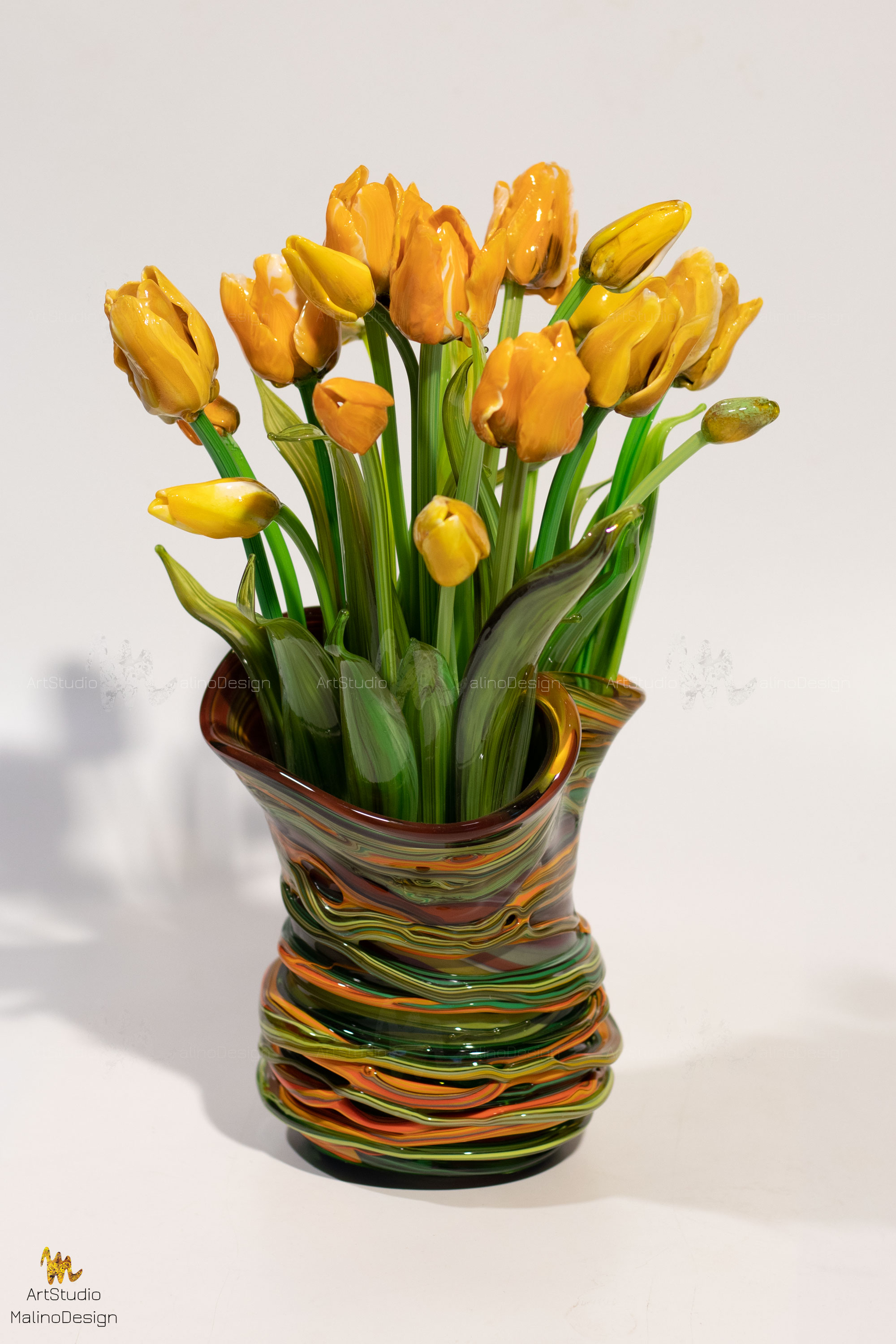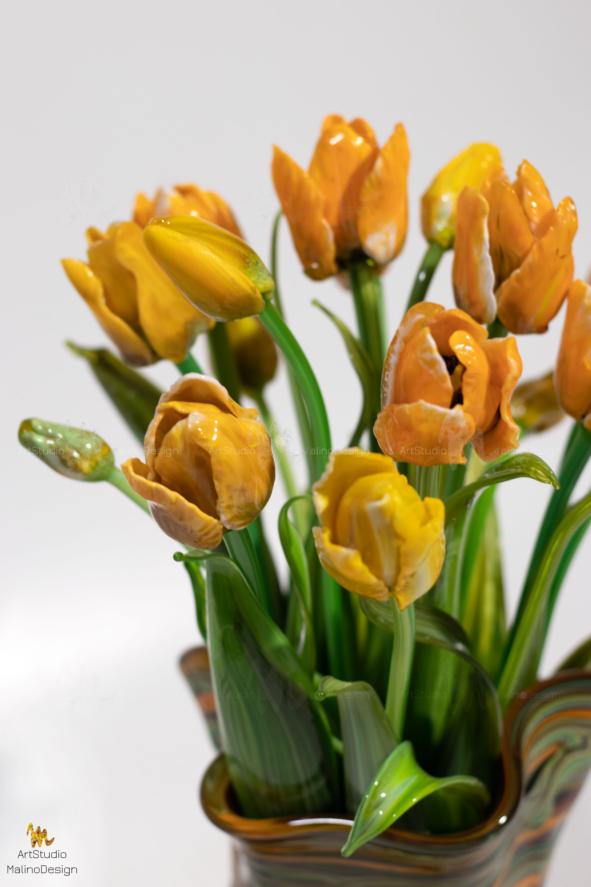 Яркое солнечное настроение этого букета стеклянных тюльпанов наполнит летом и теплом ваш дом, ваши мысли и ваши дни.