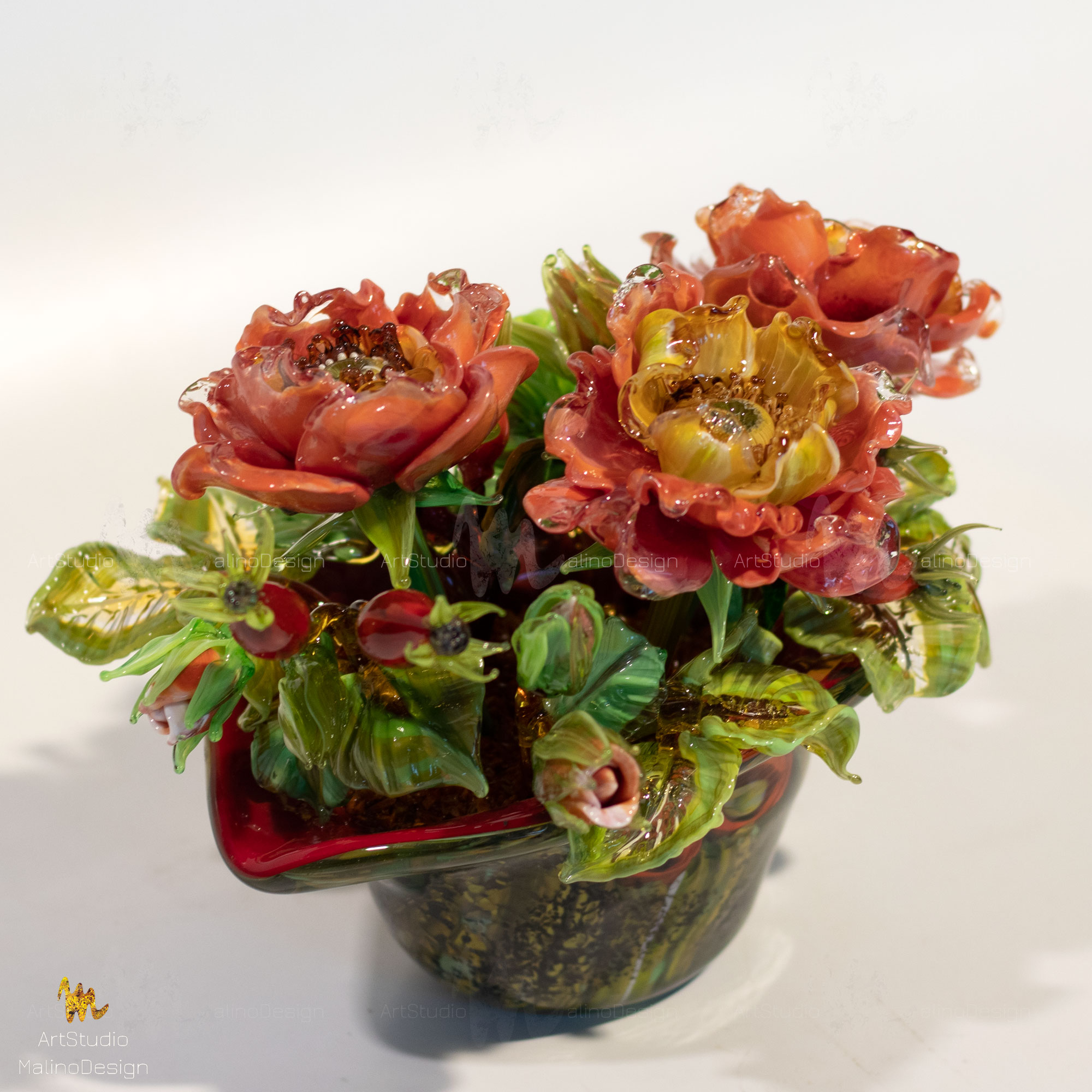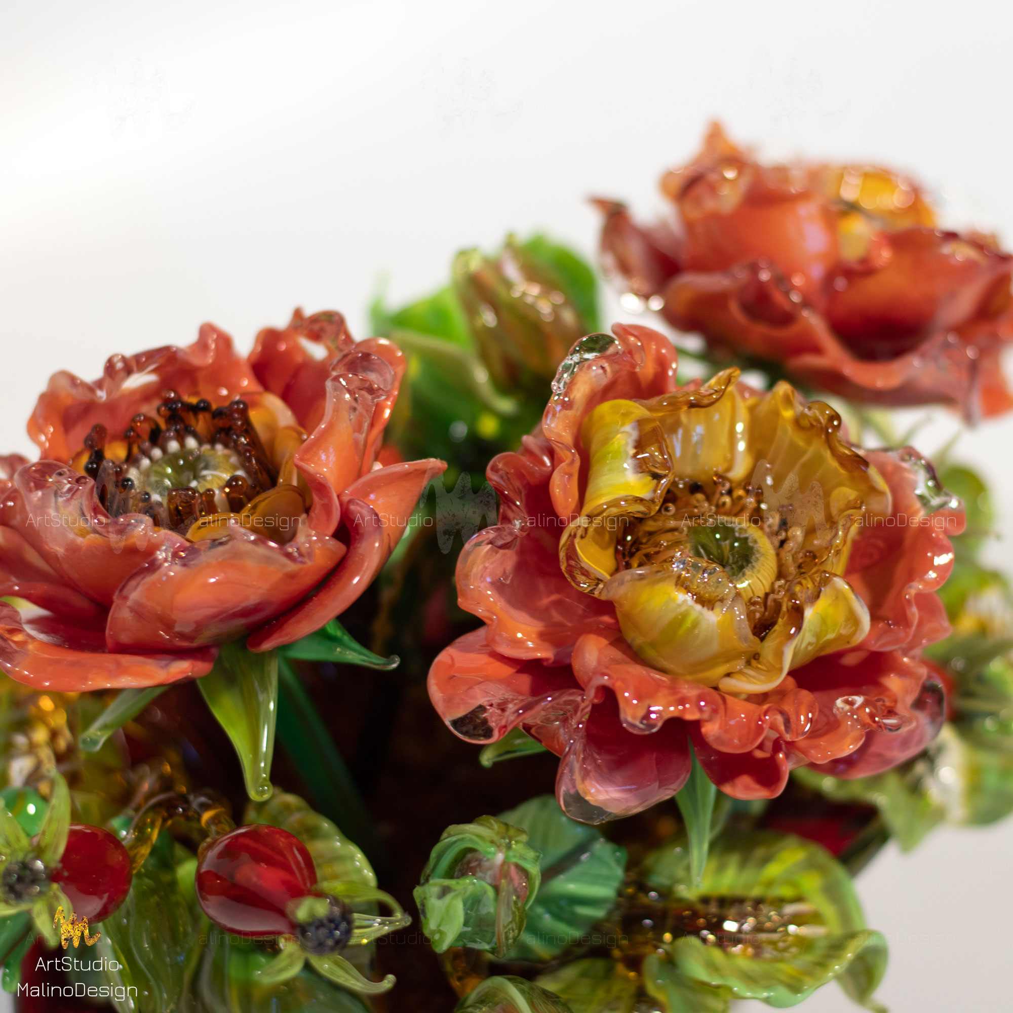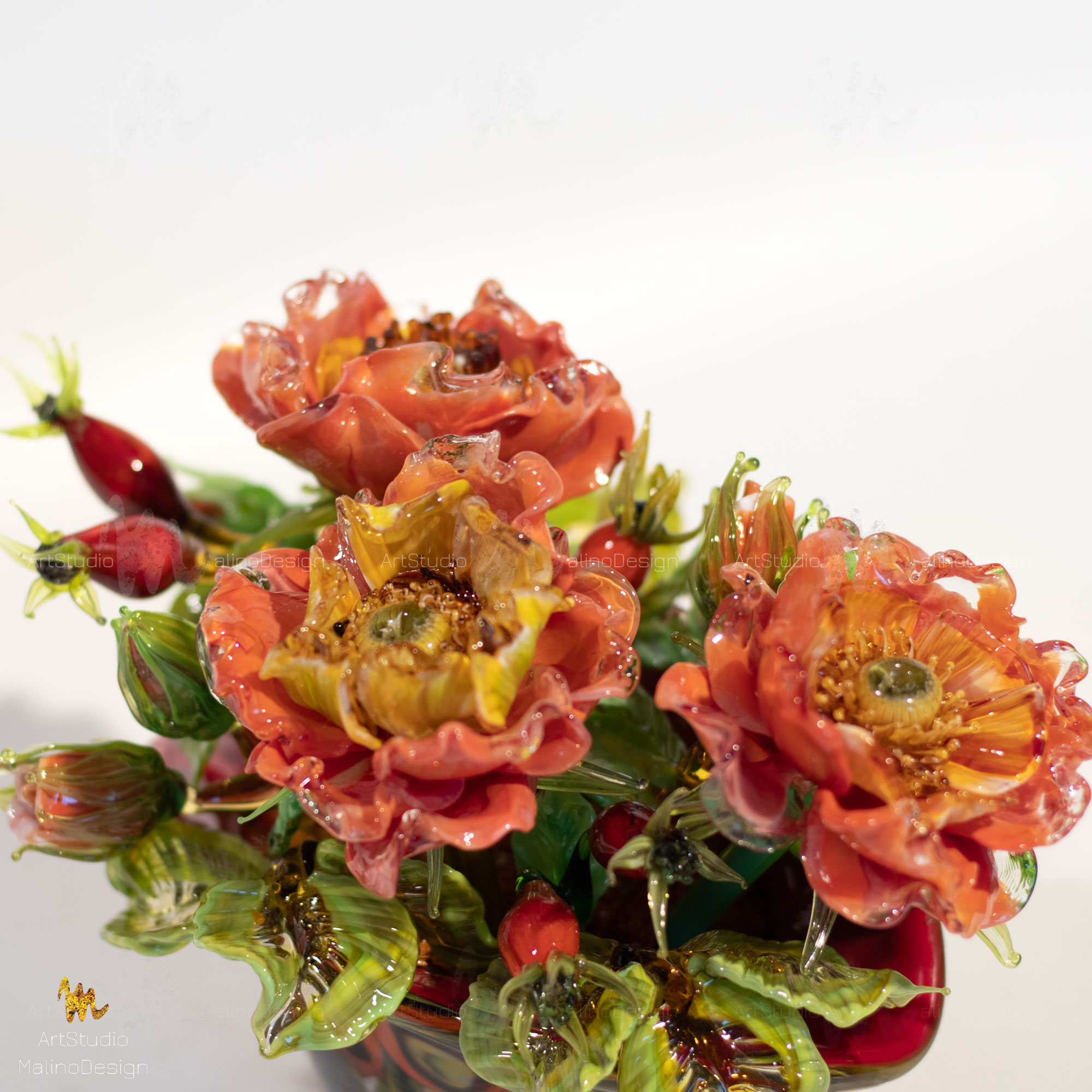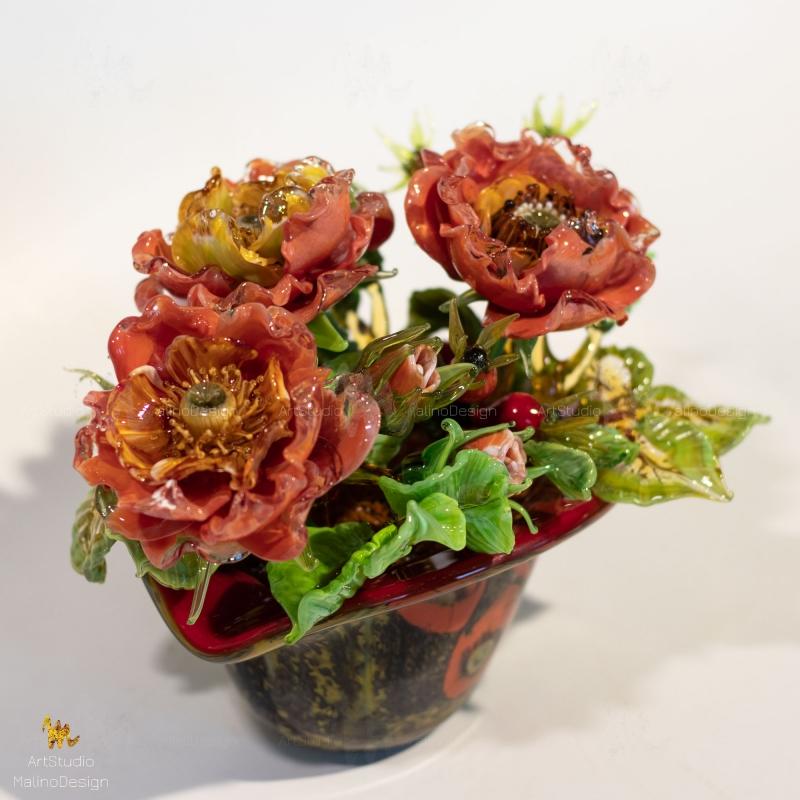 Небольшие букеты из цветов шиповника созданы из цветного стекла. Если вы решите стать обладателем хрупкого и сложного изделия, обязательно ознакомтесь с правилами ухода за нашими стеклянными цветами и букетами.
