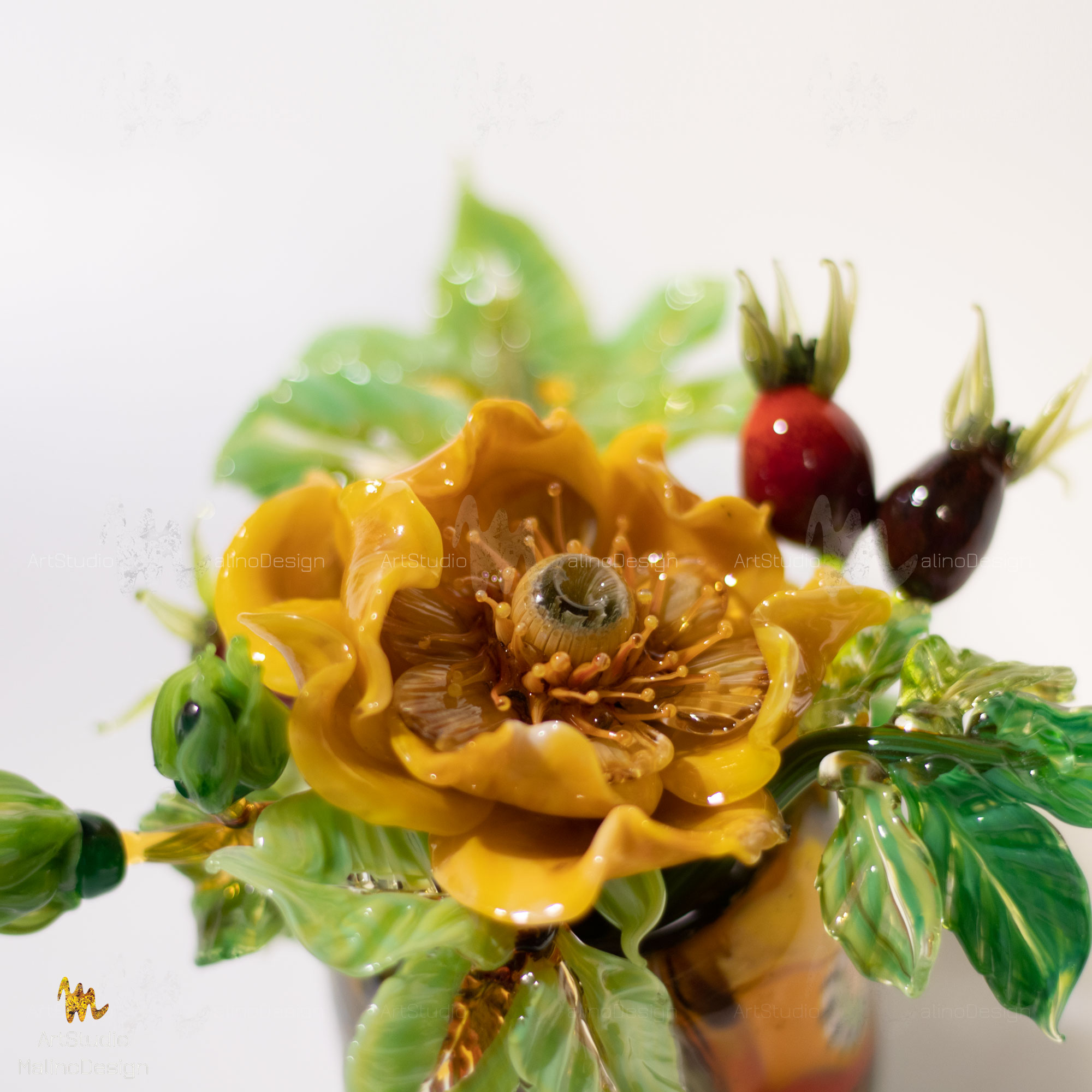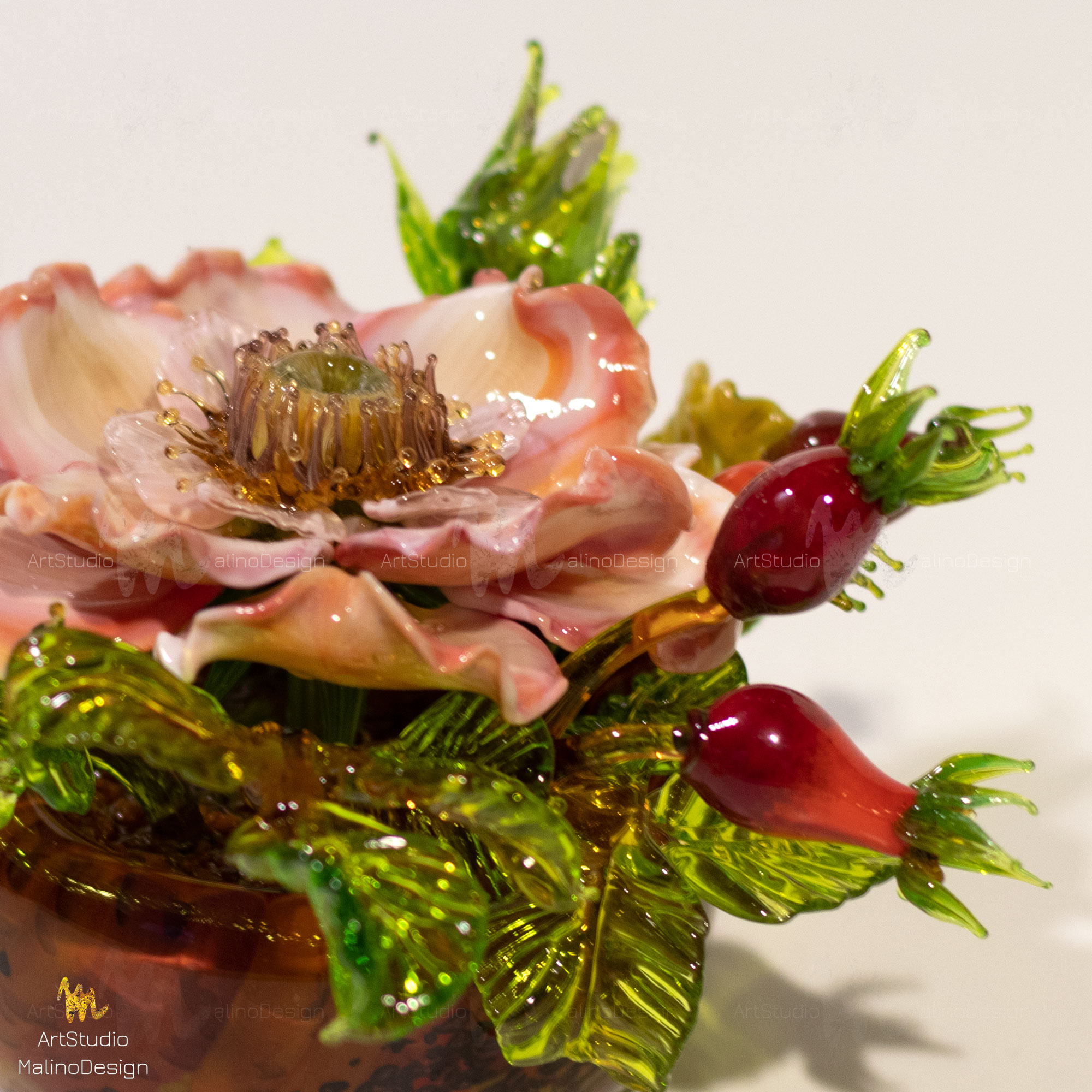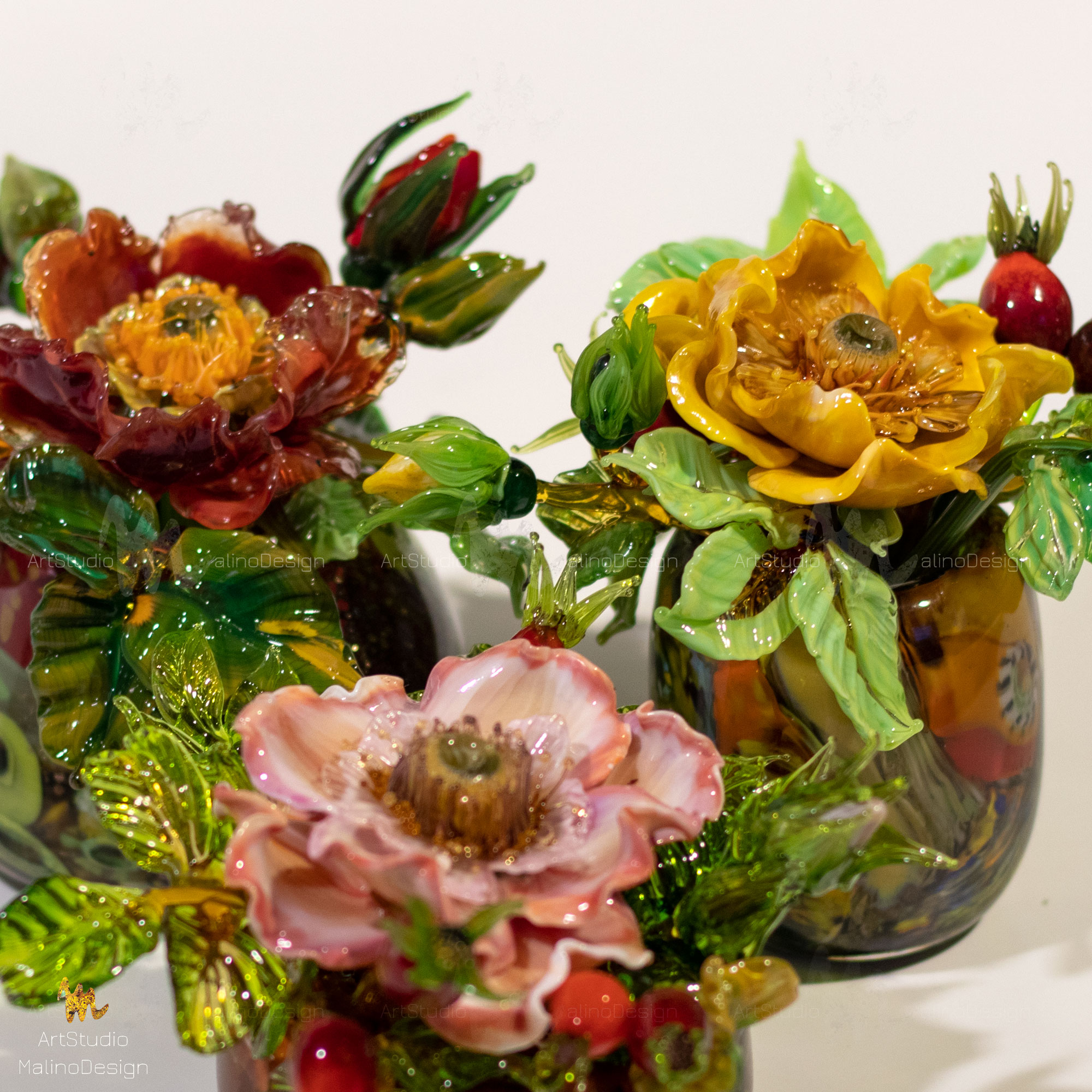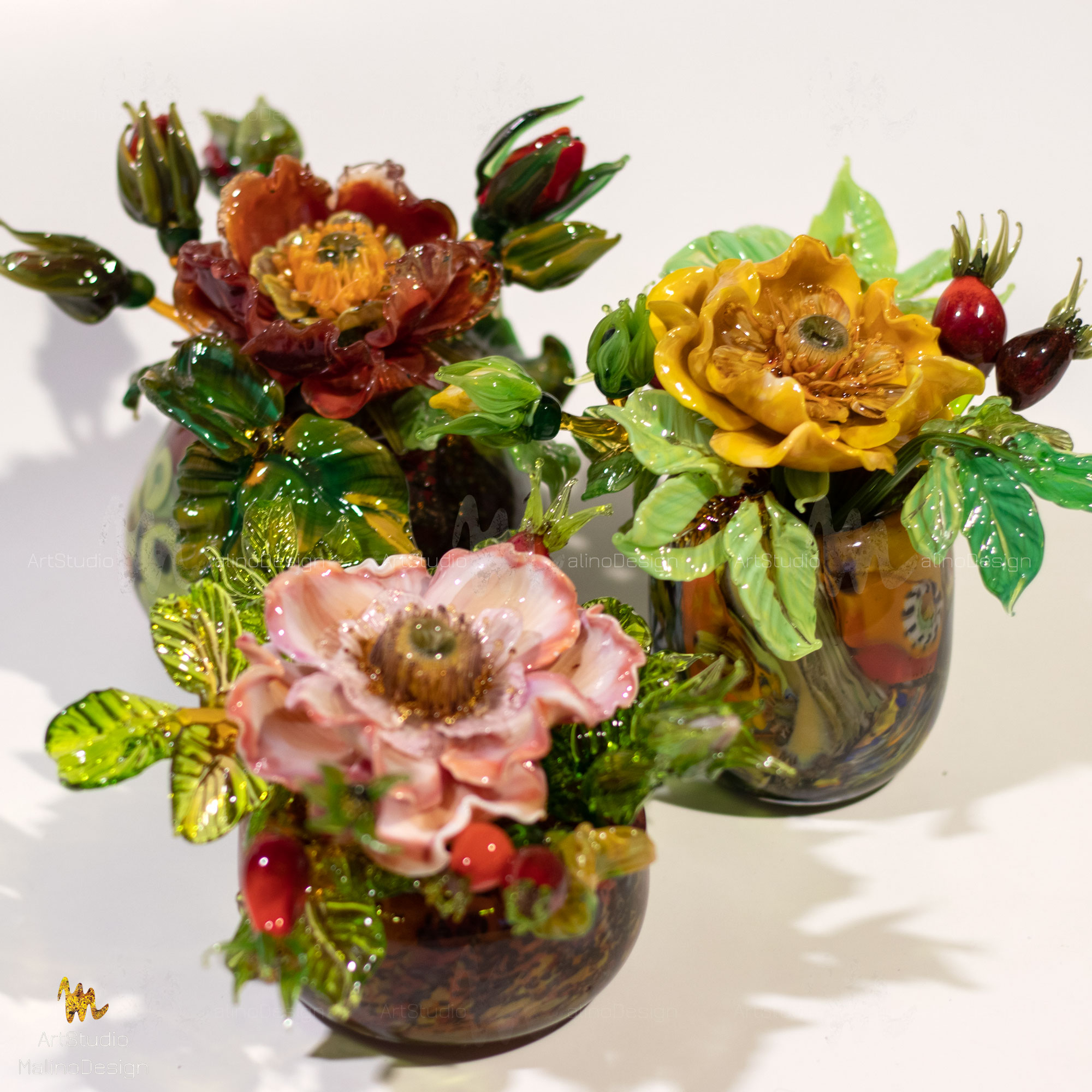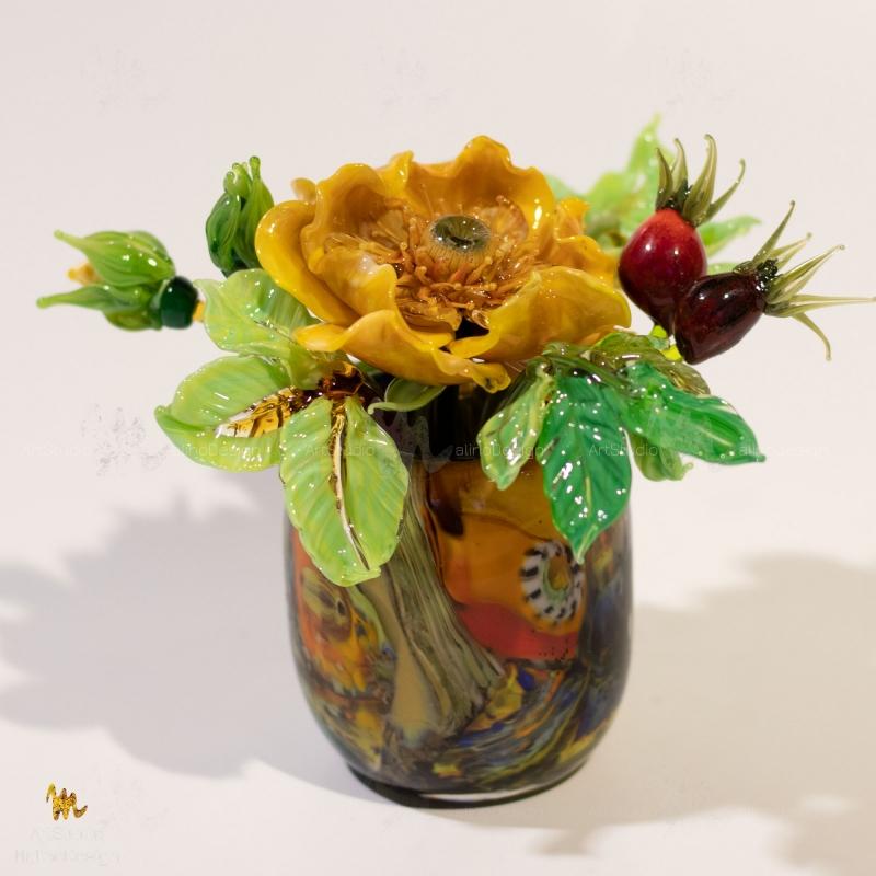 В этих композициях главный герой - полумахровая роза/шиповник в окружении бутонов и ягод. Мы собираем их в небольшие вазочки. Цветовая палитра бесконечна, так как для нас главное - живопись, игра нюансов цвета и бликов в стекле.