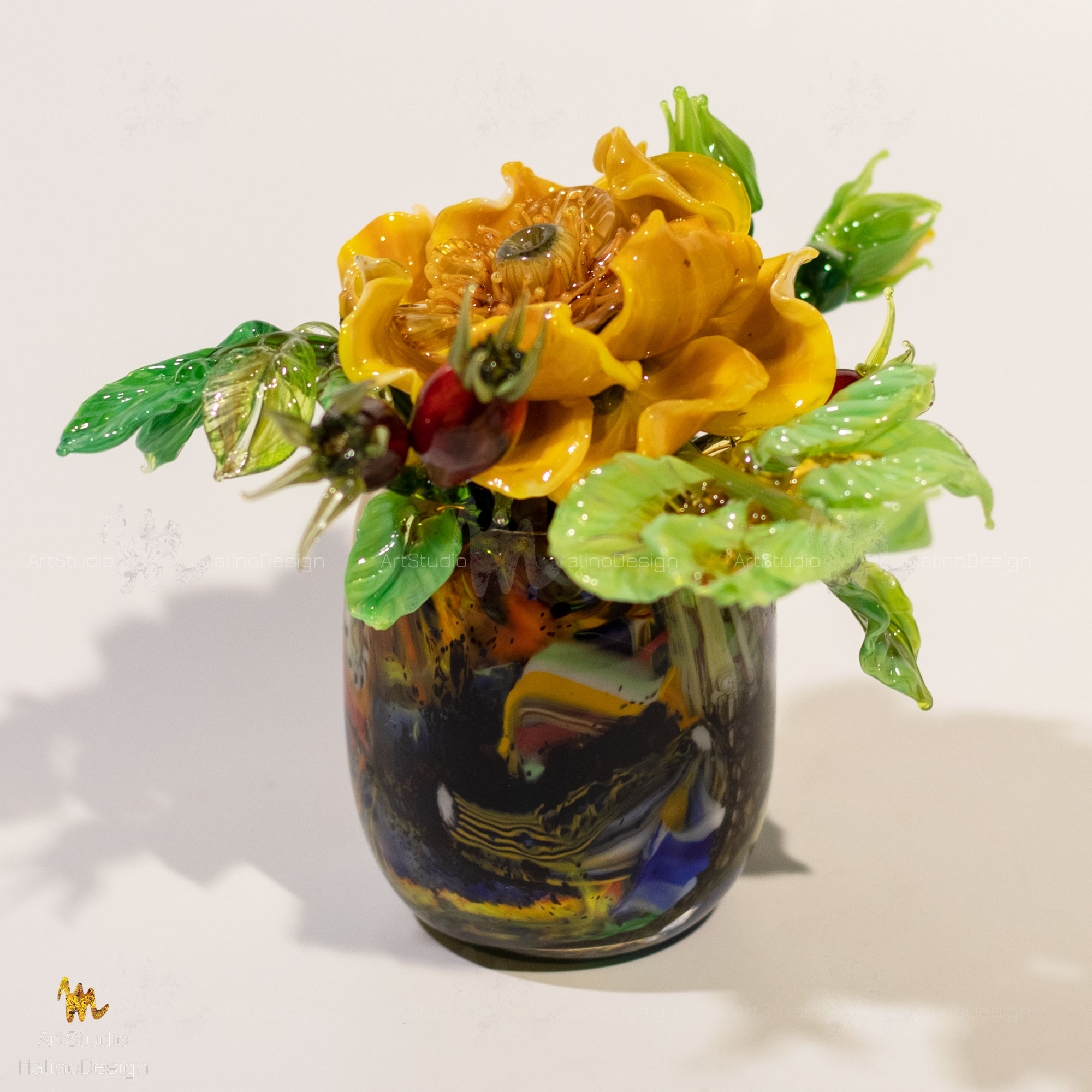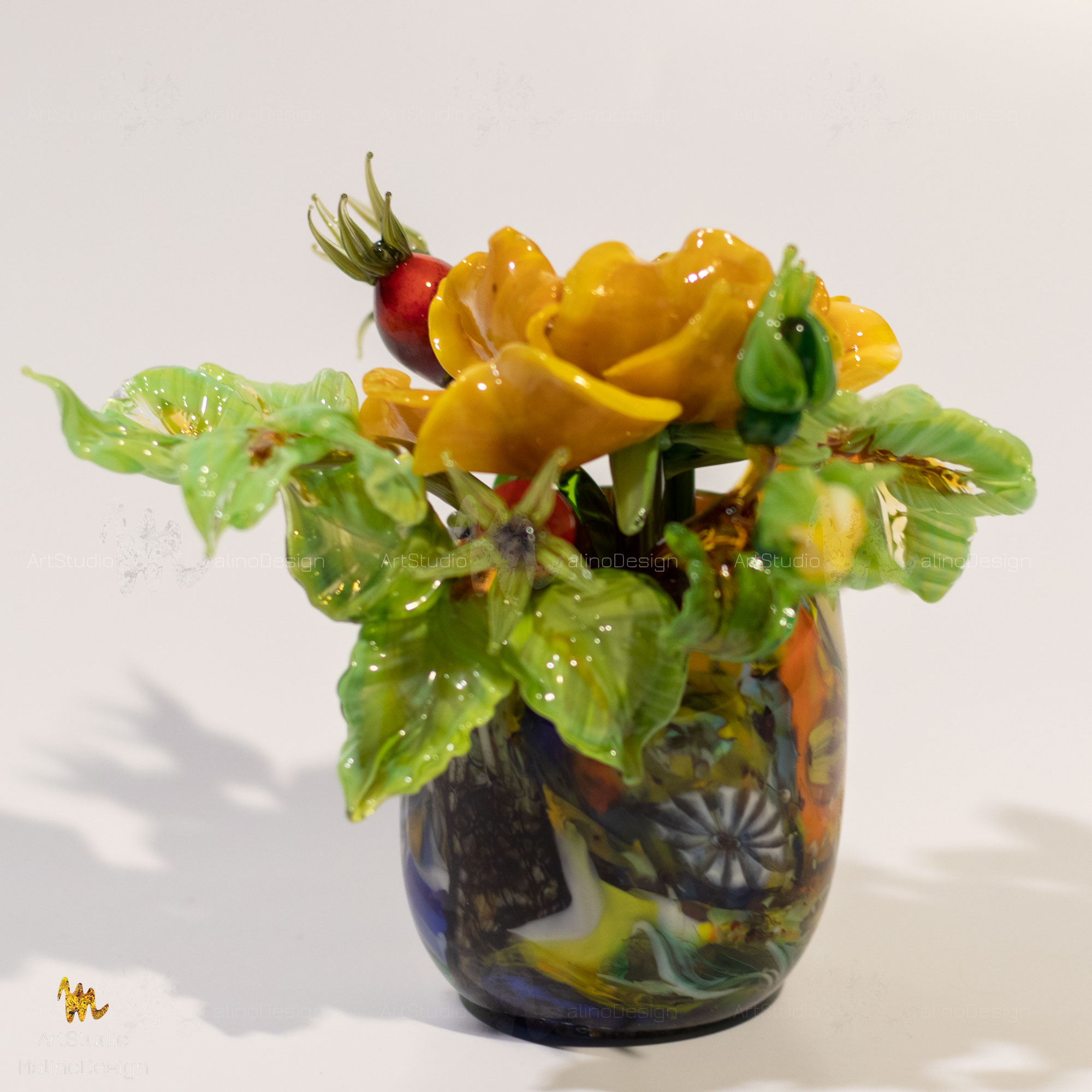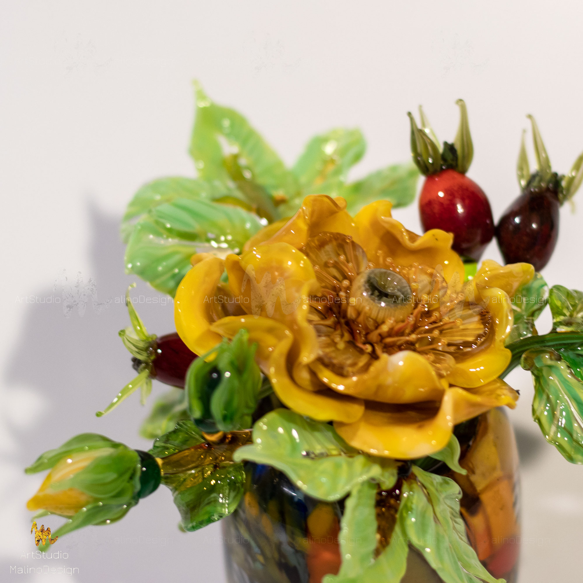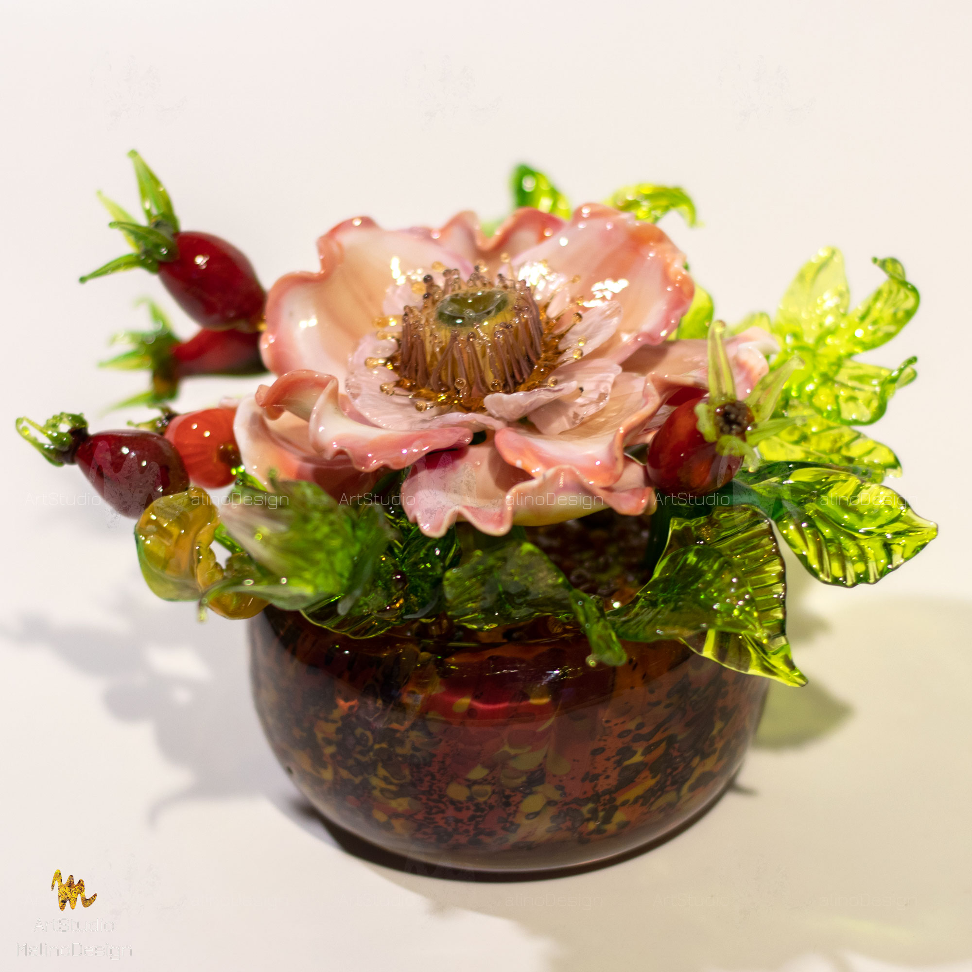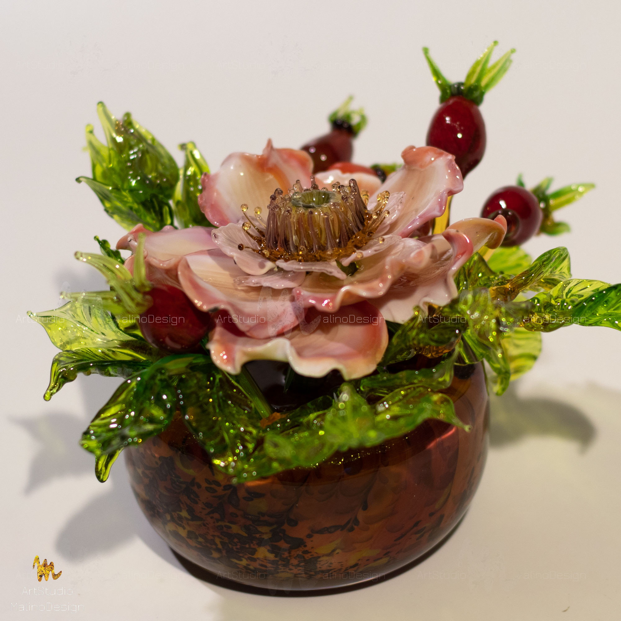 В этих композициях главный герой - полумахровая роза/шиповник в окружении бутонов и ягод. Мы собираем их в небольшие вазочки. Цветовая палитра бесконечна, так как для нас главное - живопись, игра нюансов цвета и бликов в стекле.